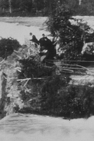 A stationary camera looks west across Niagara Falls from the United States' side (the Niagara River rushes toward the falls from right to left). Virtually overlooking the falls and surrounded by the swift current not far from the camera is a small island where six or eight tourists watch the water, talk, and move about.