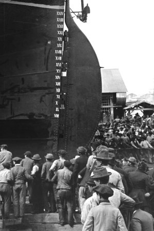 At the launch of a ship, of which we can only see the hull, the audience moves aside.