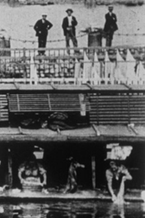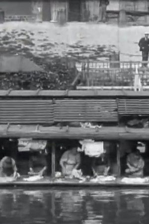 Women wash clothes in a washhouse on the edge of a river.